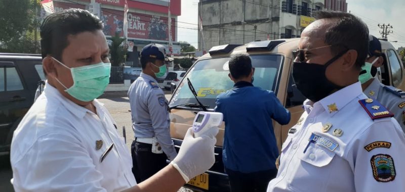 Selain penyemprotan disinfektan pada angkutan, petugas Dishub juga melakukan pengecekan suhu tubuh para sopir angkot dan juga penumpang.